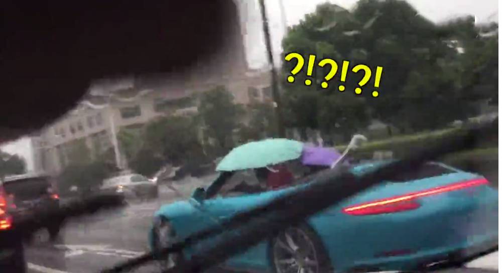 【你开心就好?大雨倾盆,男子打雨伞开敞篷跑车】9月25日,江苏常州倾盆大雨,一名车主开着保时捷敞篷车在路上行驶,车后伸出一根长长的钢管,也许是因为它,司机不得不冒雨前行,打着伞开敞篷车...