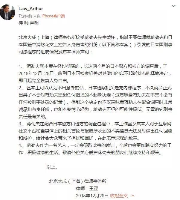 今天蒋劲夫在中国的律师发布了正式声明,声明中表示以下三点:1、蒋劲夫经过长达两个月的警方调查后,在12月28日被日本警方提出不诉的决定;2、本案情节轻微;3、蒋劲夫会吸取教训,积极健康的生活。