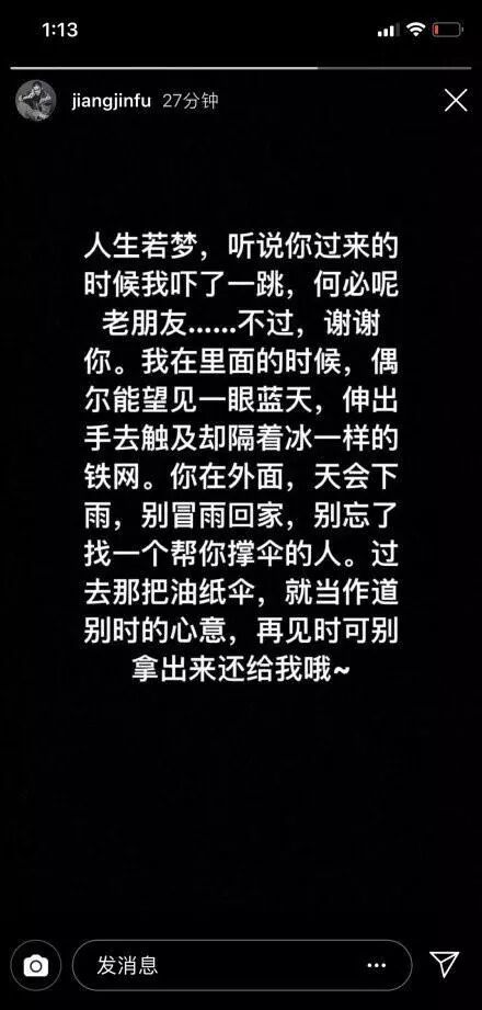 蒋劲夫本人也于今天自拘留后首次发文,他称:“听说你过来的时候我吓了一跳,何必呢老朋友……不过谢谢你。我在里面的时候,偶尔能望见一眼蓝天,伸出手去触及却隔着冰一样的铁网……”这段话被网友夸奖有文采但是却也让他昔日粉丝感到心酸。