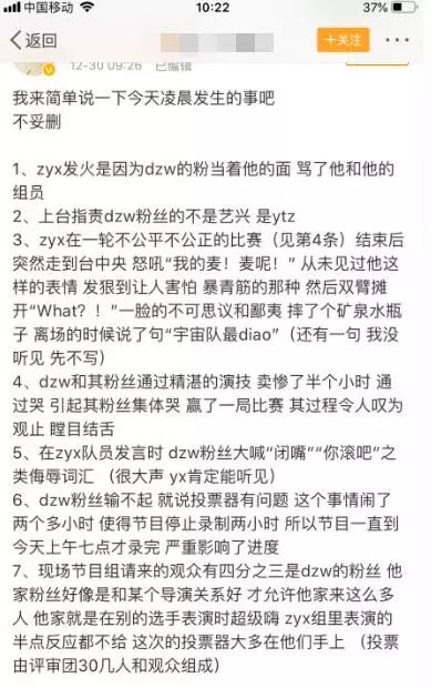 网友还表示,大张伟粉丝在张艺兴团队表演时一片寂静,还在他们发言时出口辱骂,因为投票器起冲突导致节目直到今天早上7点才录完,并怀疑大张伟粉丝因为跟导演关系后大量入场。不过对于此网友的爆料,随后大张伟粉丝对此一一解释否认,表示大张伟粉丝没有骂张艺兴,是张艺兴误会了,然后杨天真指责了大张伟粉丝。