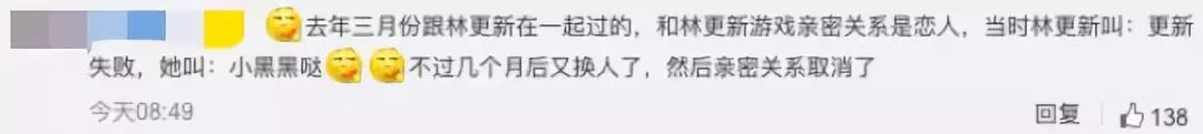 不少吃瓜群众猜测她可能是王思聪的新女友,不过婊哥倒是有看到不少知情人说他们只是好朋友,两人认识很多年了,还有人爆料她跟林更新在一起过,他们在游戏里的亲密关系就是恋人,后面同框还被拍到过~不过都是往事啦,林更新现在的恋情挺稳定的!