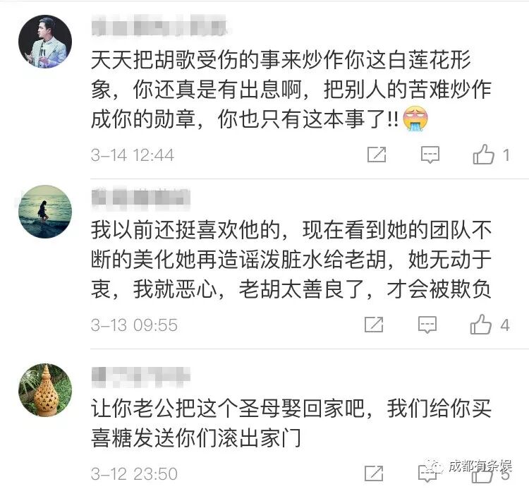 原来粉丝不爽的,是面对网络上铺天盖地对两人恋情添油加醋的传闻和评论,作为站在舆论有利一方的她,并没有为老胡辟谣,而且任由复合绯闻漫天炒。