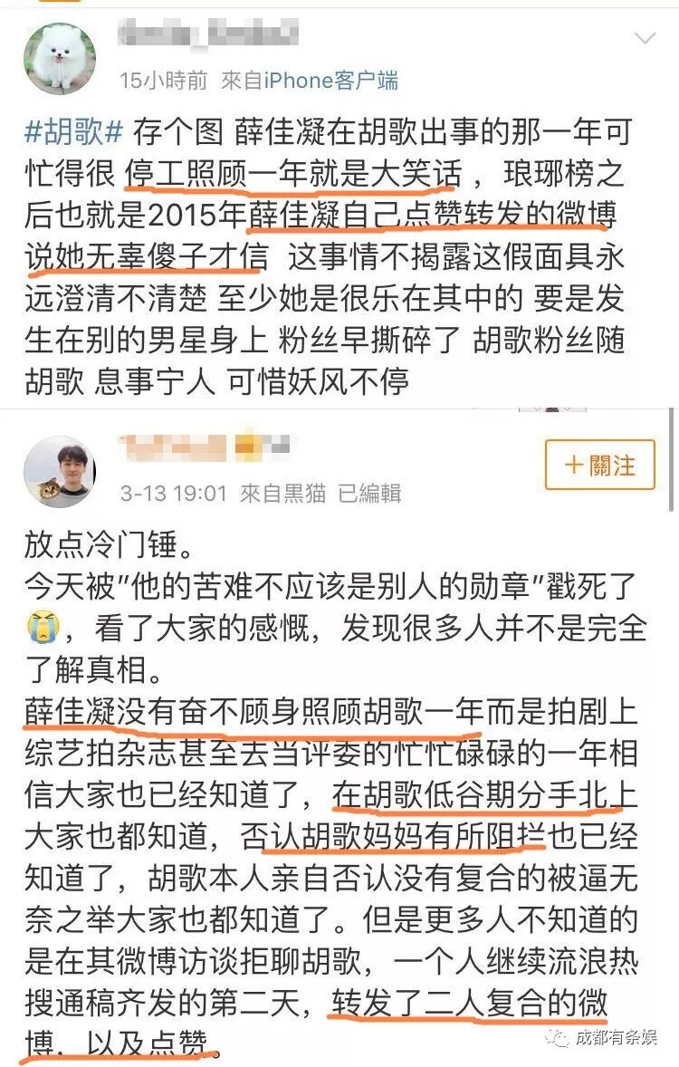 从上面两个粉丝的言论来看,主要的纠结点其实就是不满在两人的恋情上,薛佳凝一方一直走高尚人设,而给胡歌背上了“渣男”、“抛弃在低谷时期对自己不离不弃女友”的身份。