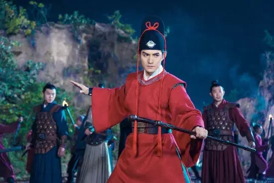 同样为武侠剧的《五鼠闹东京》,严屹宽把自己的优势发挥到极致,天生一张棱角分明又浩然正气脸的严屹宽,扮演一身红色装,腰佩锋利宝剑,四品带刀护卫的武侠男神“展昭”,除此之外,他更是过足了戏瘾,不仅分饰两角,而且不断变化马甲,一会还是俊朗正派的南侠展昭,一会又切换到偏狭狡黠的小诸葛沈仲元,闪变马甲过程中还会有下面这种画风的切换。