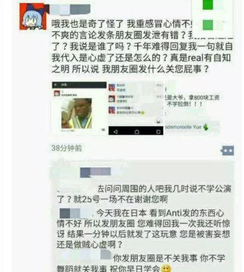事情起因是半年前,315恩队公演翻车李艺彤虽然没上翻车的不良示范,但也在公演中。因为别人告诉黄婷婷李艺彤不练舞(去日本玩了),黄婷婷就出于副队长职责督促练舞。结果李艺彤一条关你屁事,辣鸡的朋友圈发出,黄婷婷就认为是在说自己,并发朋友圈表示,自己一个月作为副队就多拿800元工资,督促你练舞还有错吗?马老师(教N队舞蹈的老师)还点赞了。