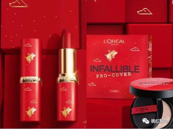 欧莱雅直接来了个名叫“飞天小猪包”的彩妆礼盒,将小猪印在瓶身,金红的配色相当喜庆。