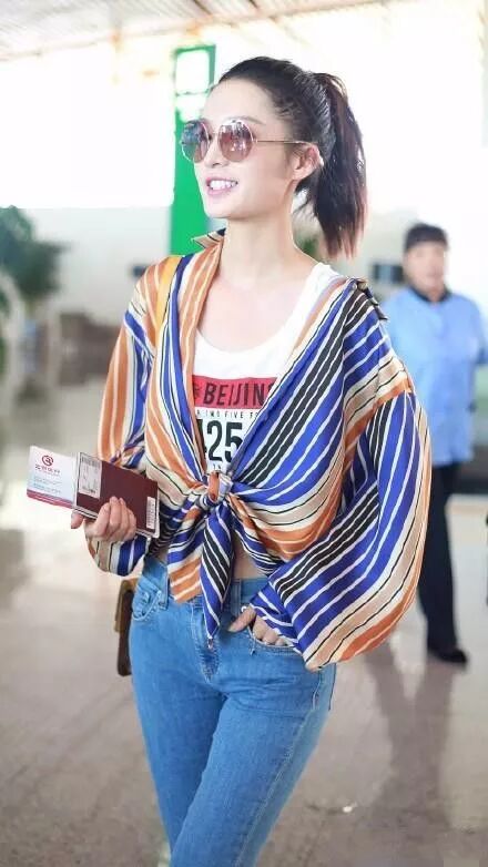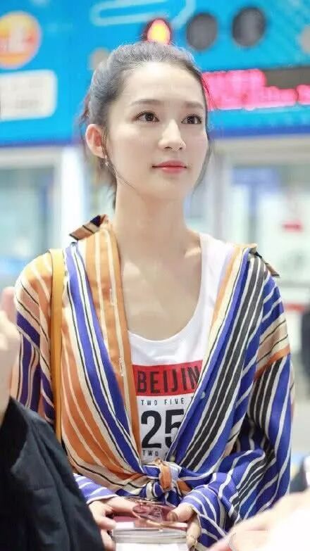 条纹款式的衬衫,让自己充满活力,李沁机场里的打扮,再一次吸引大家眼球,苗条迷人,身材超群。