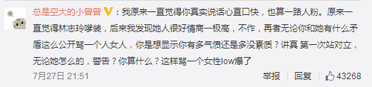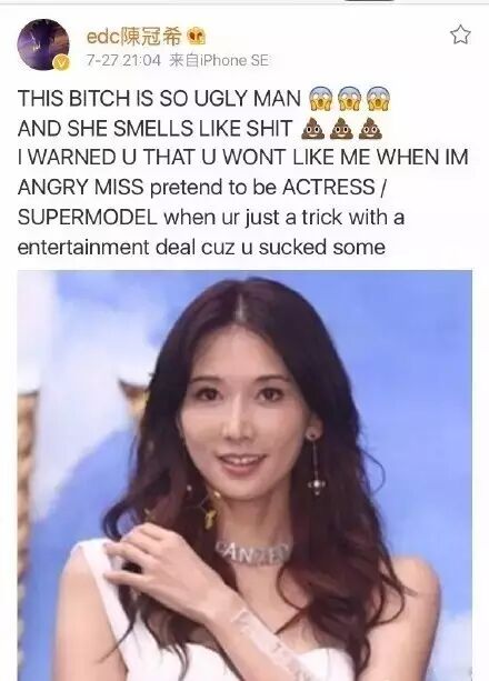 连骂林志玲是“婊子”、“闻起来像屎”……虽然事后删文、并表示“早就警告过她了”,但没说为何要骂林志玲。关于这件事的背后原因,网络上也出现了几种说法,传出疑是为了替女友的闺密出头。随后21:43,陈冠希再次发文“我为什么要骂她?她知道的,我早就警告她了。你们问一问她吧!谢谢你的合作!你可以说我错,不过我觉得她比较错吧”。