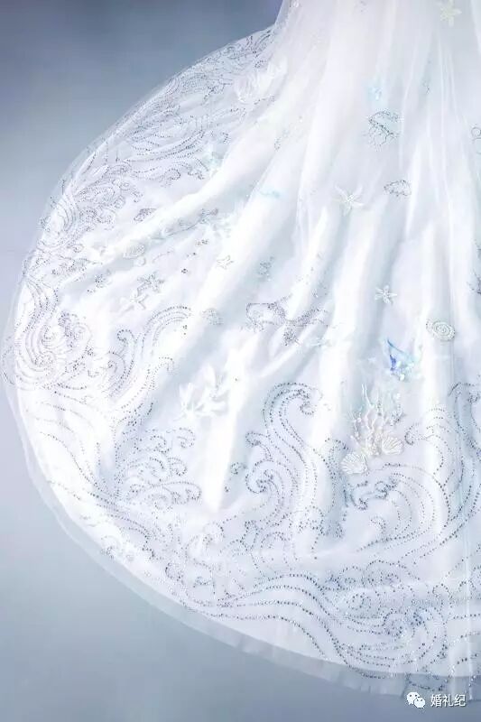 钟丽缇的主婚纱是兰玉设计的,兰玉将她的经历设计成了一副美人鱼在海底世界找到真爱的美丽画卷,把数万颗水晶镶在了婚纱上!