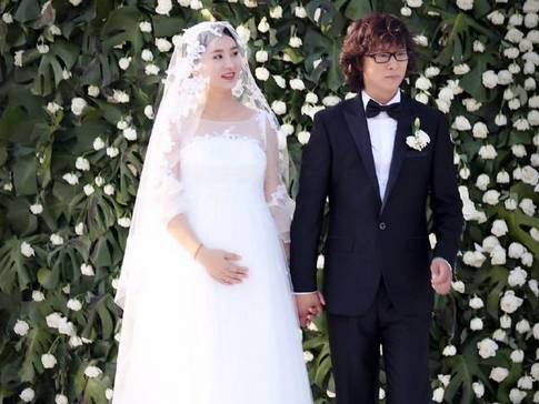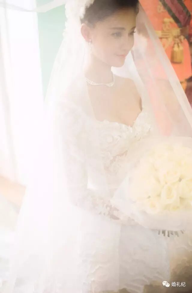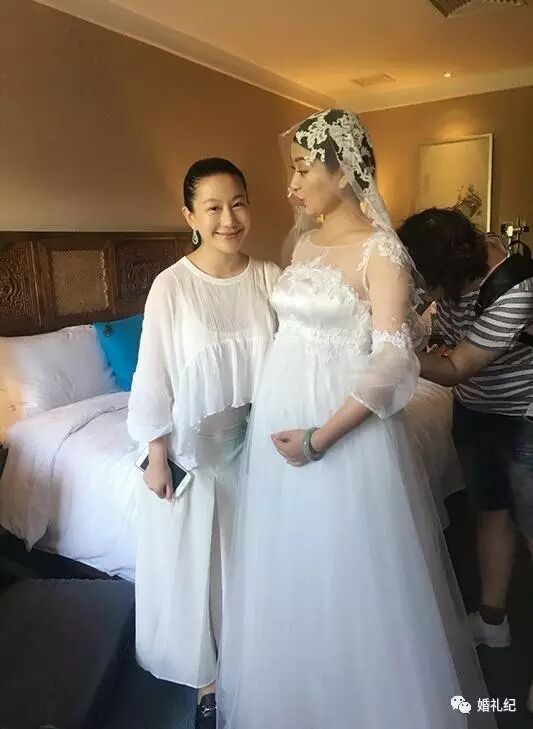 眉庄举行婚礼的时候,身孕已经6个月了,婚纱不出意外是高腰设计,设计师是国内婚纱设计师兰玉。