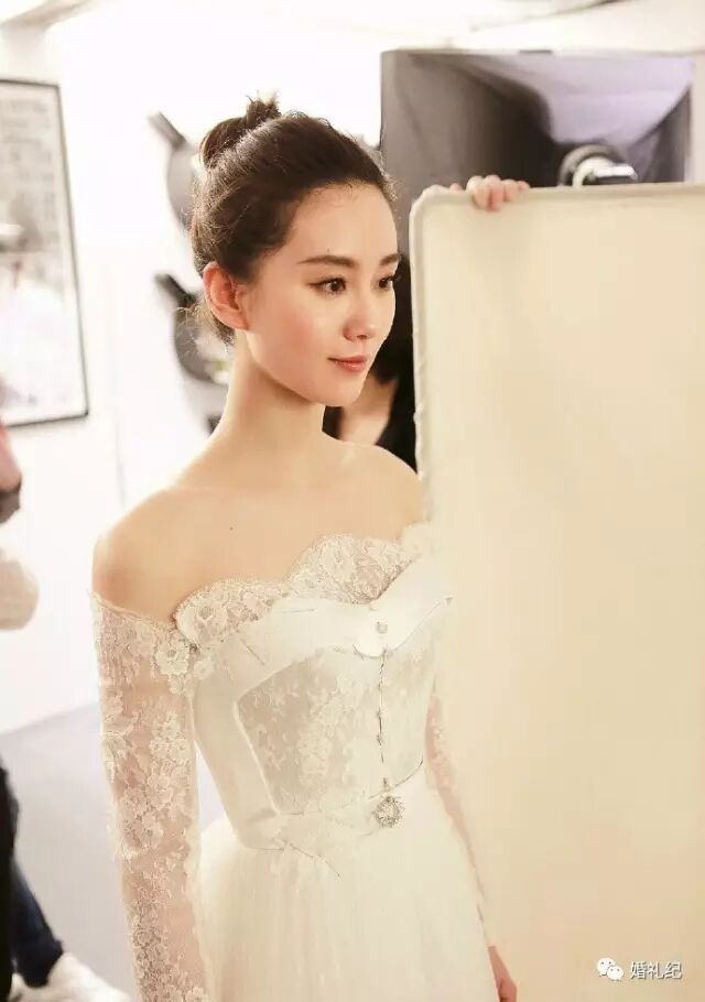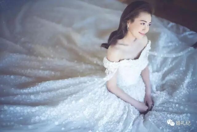 这款婚纱的肩部设计为落肩式,对因为怀孕有点发胖的陈妍希来说,特别显瘦。