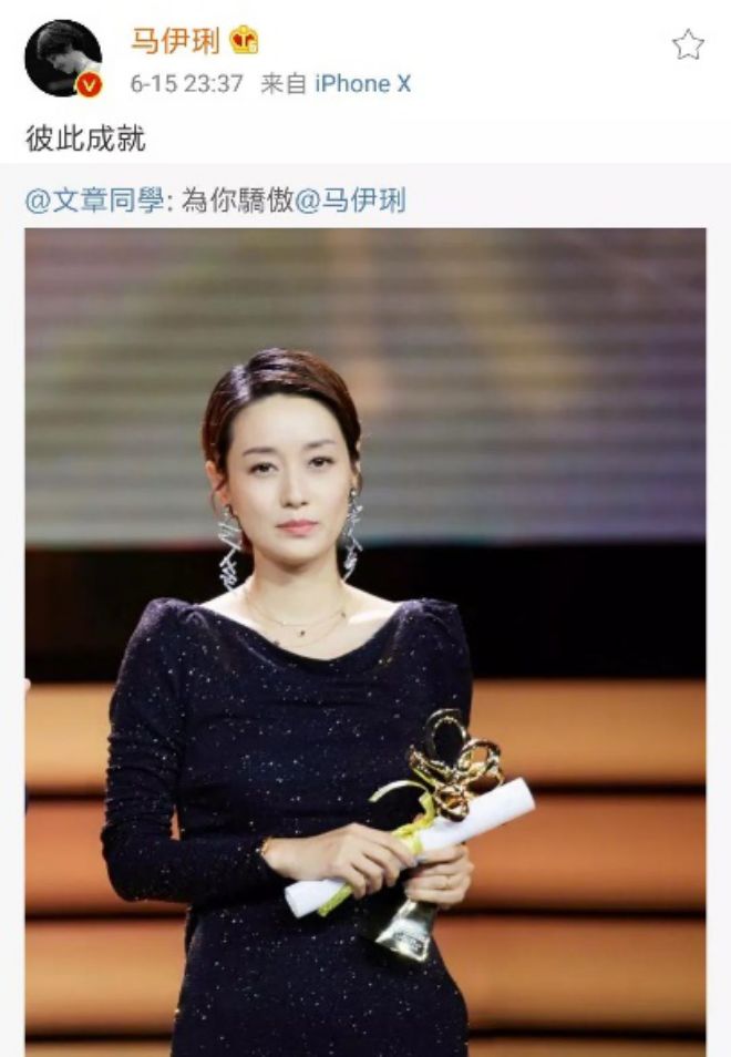 颁奖典礼后,文章在微博上转发了马伊琍获奖的照片,并配文:“为你骄傲”,马伊琍回复了四个字“彼此成就”。