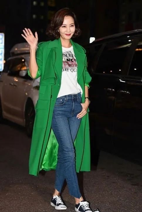 在很多韩国人眼里,金南珠的颜值和演技都是成正比,不仅样貌有料才华更是横溢,下图照片中,金南珠穿了一件白色T恤打底搭配深色紧身牛仔裤,外加一件墨绿色风衣外套,显得她漂亮大方,气场十足。
