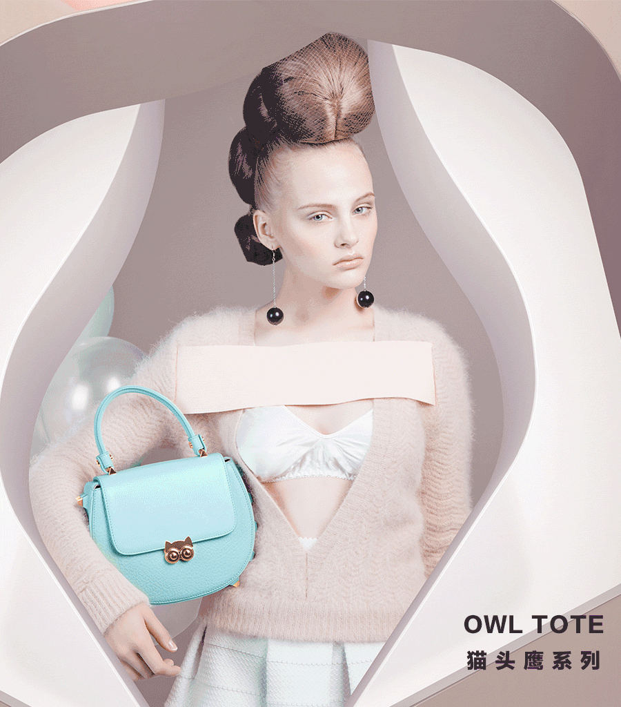 甜美的糖果色,令人心情愉悦,超大号的铆钉将无拘无束的风格展露无遗,而猫头鹰形状的锁扣设计,无疑是点睛之笔,让手袋平添许多的趣味。