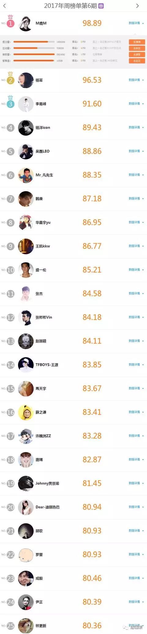 看完前十名,让我们再来回顾一下,第六期榜单上榜前二十五名的明星排行和得分吧!