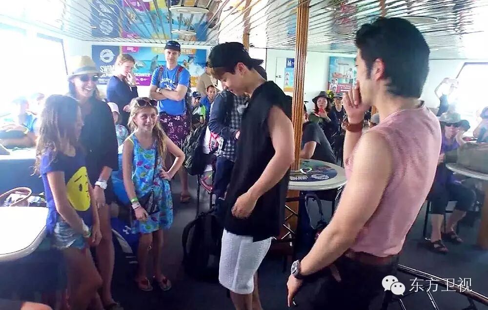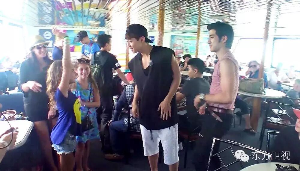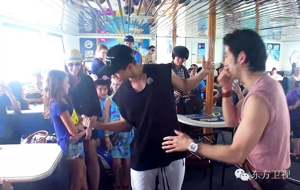 配合着李治廷的口技RAP,接受挑战的小女孩毫不羞涩。虽然技巧不足,但有模有样的架势,凹胸、甩发,拽拽的劲头一点不输大人。看着小女孩的认真模样,Henry也不怠慢,拿出了演唱会的水准。一转身,一滑步,一招一式都透着偶像光环。船上的外国友人不约而同地响起掌声喝彩。
