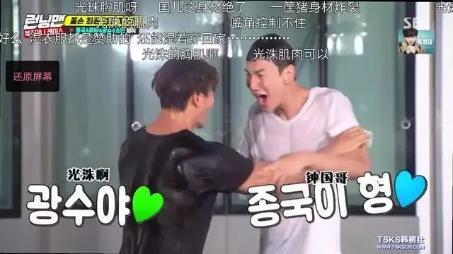 强行给金钟国加了两场戏,让我们的国儿不至于这么孤单。最终,在节目最后,wuli国儿跟光洙上演了一场“脱衣show”,来了一个完美的ending。希望《Running Man》以后越来越精彩,钟国越来越开心。