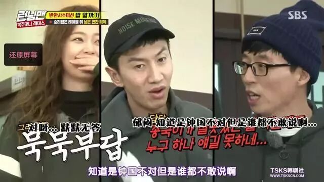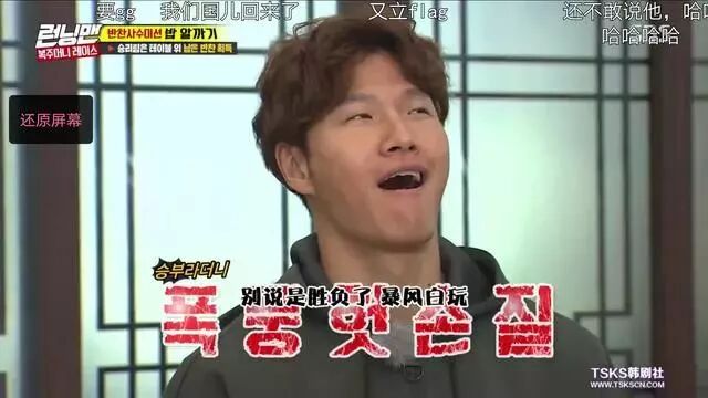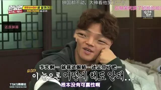 在吃饭的时候,金钟国所在的队,因为打棋子输了,所以只能吃米饭+紫菜。金钟国的队伍,成员结构真的是不容小觑,臭手三人组有两个,刘在石、李光洙,飞蛾三人组全昭旻全员,在能玩能搞的队伍里,金钟国注定要安安静静的吃饭。