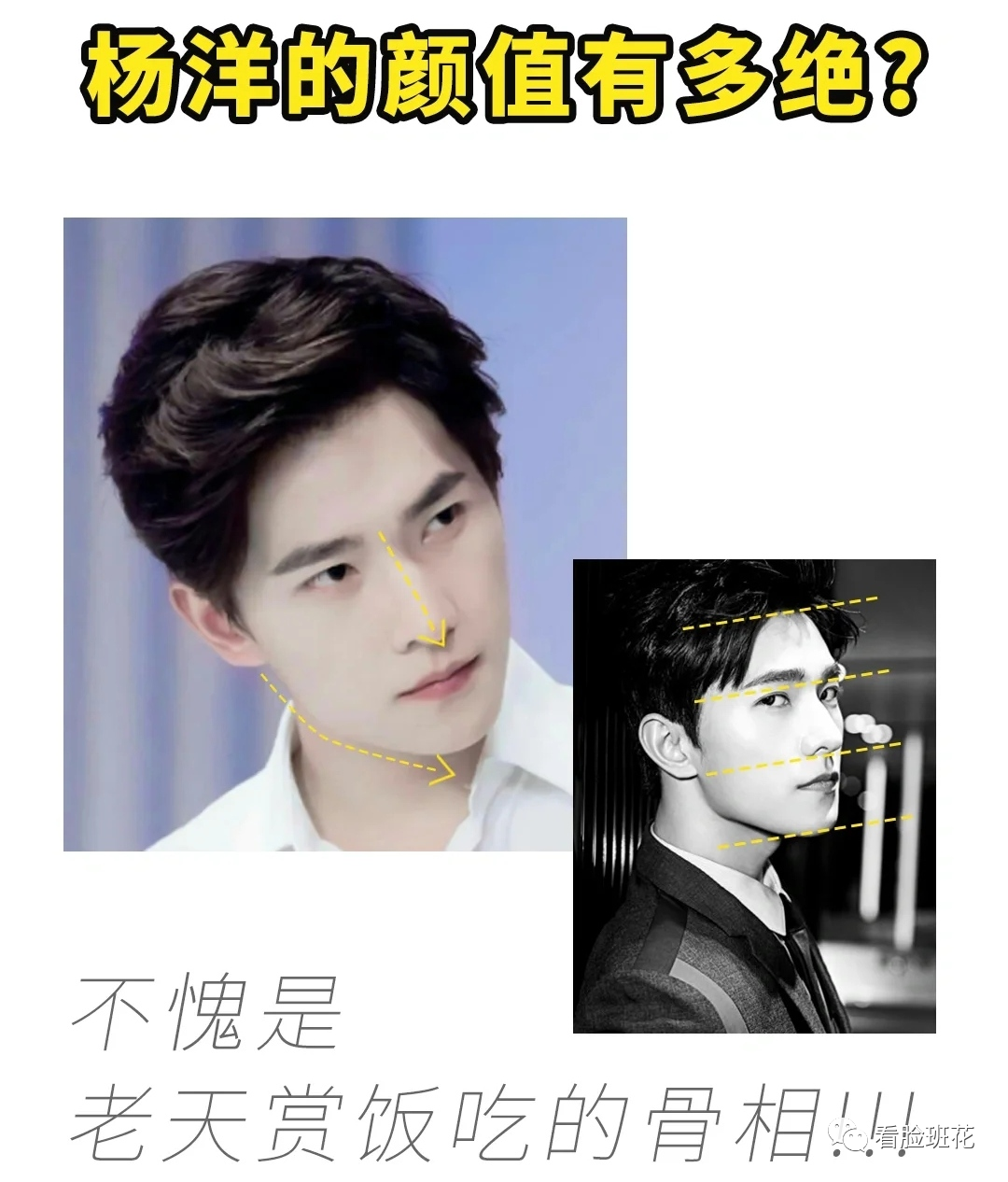 杨洋五官很秀气,白皙的皮肤,软组织比较少,给人的感觉很舒服,面部比例优秀,折叠度高,可以简单的理解为“正脸窄+侧面纵深长”,所以总给人一种脸很小又精致立体的感觉。杨洋的三庭五眼非常符合面部审美标准,恰到好处的整齐的发际线,增加了男性硬朗的线条感,下颌角拐角高,是标准的120度,且清晰不外翻,给原本男孩的脸上,又增加了一丝男人的魅力。