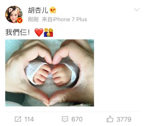 10月13日,胡杏儿在微博上晒一家三口比爱心合影宣布当妈,配文:我们仨!正式成为美丽的新手妈妈。