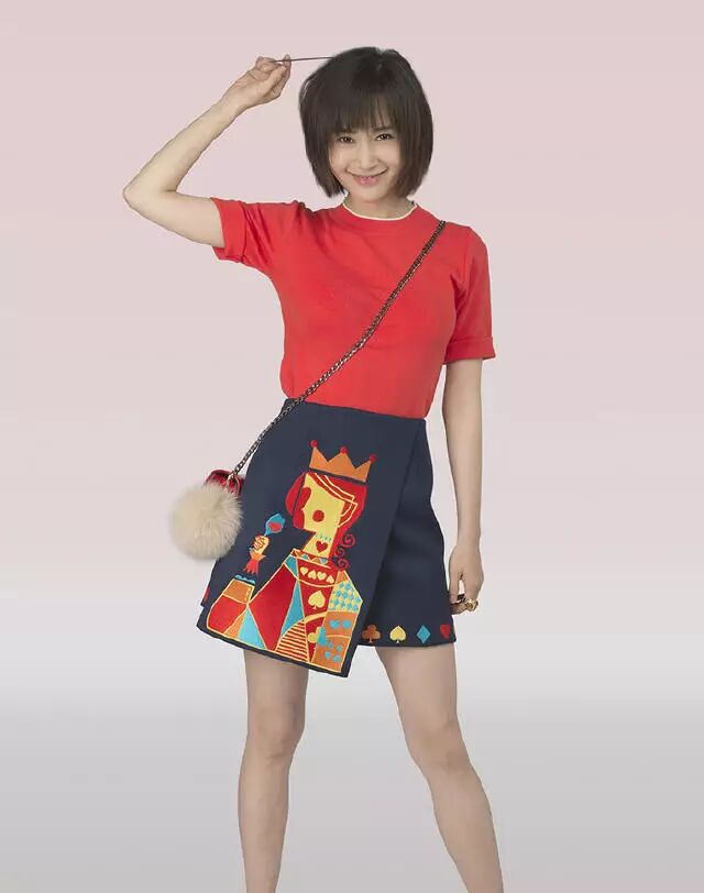剧中她的这套衣服可成了爆款,红色的T恤搭不规则的印花半身裙,很简单又显腿长。