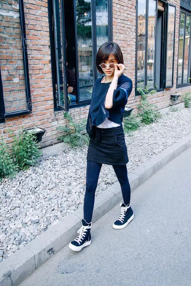 私服街拍这样穿运动短裙,上衣搭宽松款,很有范儿。