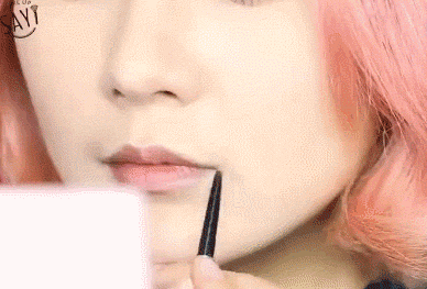 Step 6:选择同色系但深一号的唇线笔,在唇珠部位画一个小三角形,打造阴影,营造嘴唇翘翘的感觉。
