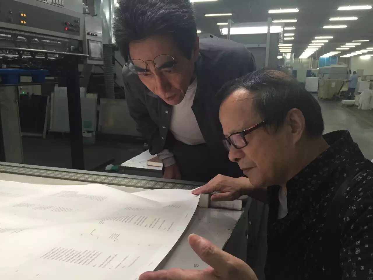图中右侧为本次访谈者施梓云。图中,他与设计师卢浩一起在印厂为《古希腊悲剧喜剧全集》加班加点。