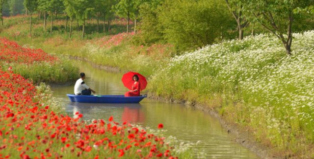 花开海上生态园位于上海市金山区朱泾镇西侧,占地600亩。由花海、梅园、樱花园、秋景园组成。春秋两季虞美人、格桑花大型花海连绵起伏,自然野趣,色彩绚丽,蔚为壮观;早春梅园多姿多彩,暗香浮动,心旷神怡;仲春樱花浪漫,海棠妩媚、玉兰雅致,一步一景;初冬时节红林尽染,荻花飘舞,曲径漫步,诗情画意。