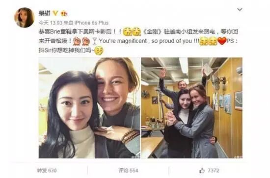 结果呢,今天,布丽·拉尔森不是获得了奥斯卡影后吗?景甜又PO了一篇
