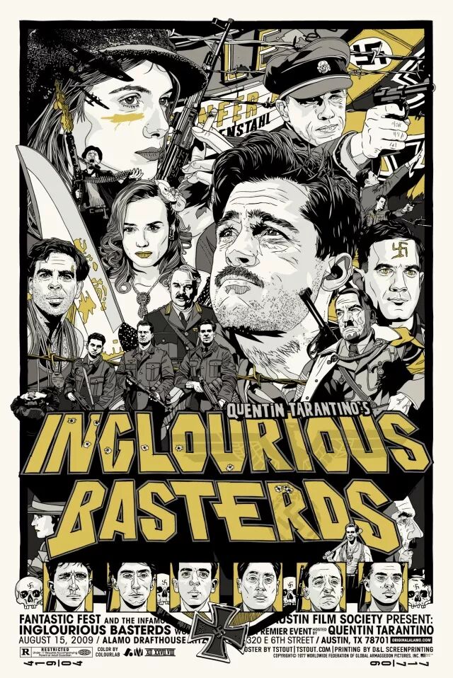 因为这部影片和昆汀的另一部影片——《被解救的姜戈》我喜欢上了Christoph Waltz,Christoph Waltz的表演实在有魅力极了,他大概是我见过半老之人中最风骚的了哈哈哈。。。不愧为老戏骨,昆汀两次成就了Waltz——Waltz因为演了昆汀指导的影片两次获得奥斯卡最佳配角。他的表演张弛有度,很难从他的诠释中看到其他演员的影子甚至看不到他自己以往演过的角色的影子,太特别了,完全教科书级别。要说这部大咖云集的电影里哪位演员最出彩,非Waltz莫属。