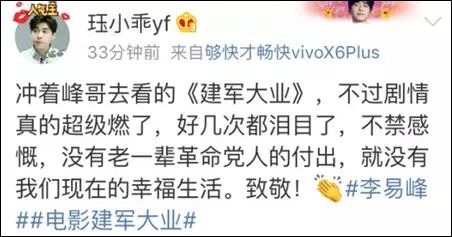 许多粉丝抱着看自家爱豆的心态走进影院,结果被波澜壮阔的革命震撼得热泪盈眶,回家就上网去查先烈英雄事迹了。谢谢《建军大业》,你这颗安利我吃!