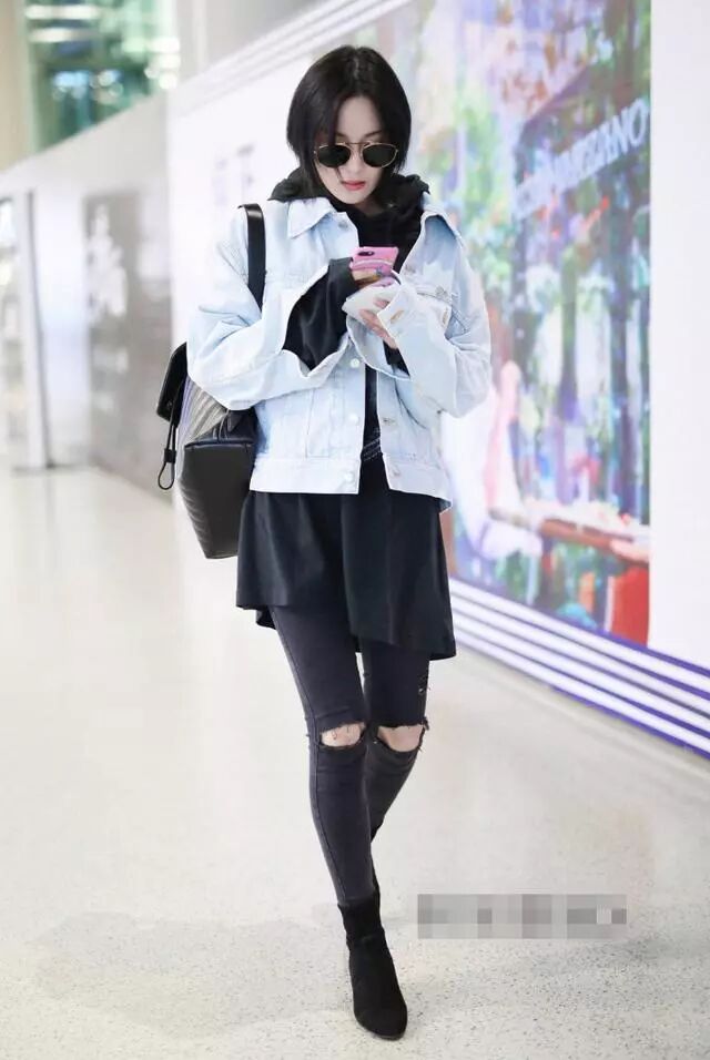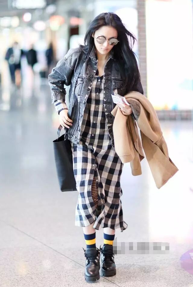 张馨予身上的这件黑白格连衣裙简约大方,但是版型比较宽松不能很好的突出身材曲线,单穿的话不免显得有些臃肿,所以搭配一件黑色牛仔外套可以很好的解决这个问题。牛仔外套可以遮挡一部分的腰部,显瘦效果非常好。搭配一双黑色高帮鞋露出一段袜子更显得甜美可爱,很有少女感。