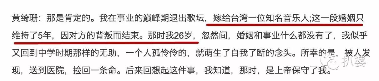 而黄绮珊在采访中的说法却是:因对方的背叛而结束。那时候她才26岁,很可怜。陷入感情事业低谷期的黄绮珊再次崩溃到自杀,所幸抢救及时才活了下来。