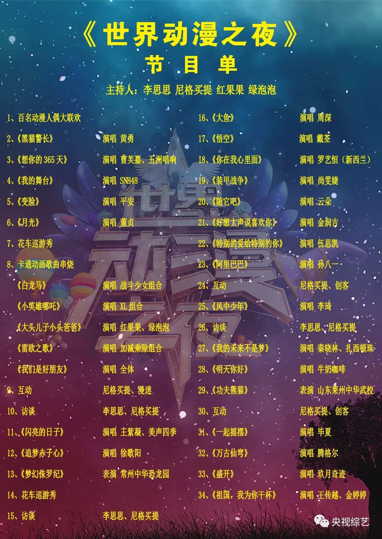 此次《世界动漫之夜》节目不仅有央视名嘴李思思、尼格买提、红果果、绿泡泡联袂主持,还有腾格尔、尚雯婕、伍思凯、平安、SNH48、曹芙嘉、玖月奇迹、王传越、戴荃、周深、扎西顿珠、云朵、牛奶咖啡、李琦等明星大咖倾力加盟,倾情演绎《黑猫警长》《宝莲灯》《西游记》《大鱼海棠》《大圣归来》《秦时明月》《人猿泰山》《冰雪奇缘》《灌篮高手》等中国以及世界的经典动漫歌曲,充分表现中国动漫的历史传承与现代发展,连接几代人的青春,触动时代记忆!