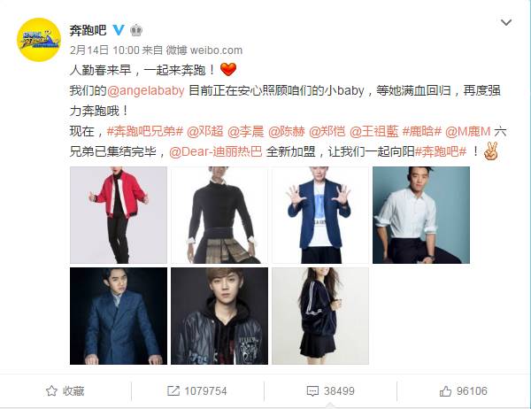 《奔跑吧兄弟》第五季改名《奔跑吧》,阵容也随即公开:跑男六兄弟+迪丽热巴。邓超、李晨、陈赫、郑恺、王祖蓝、鹿晗阵容不变,不过angelababy替换成了当红小花迪丽热巴。