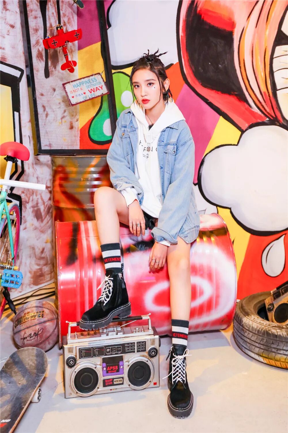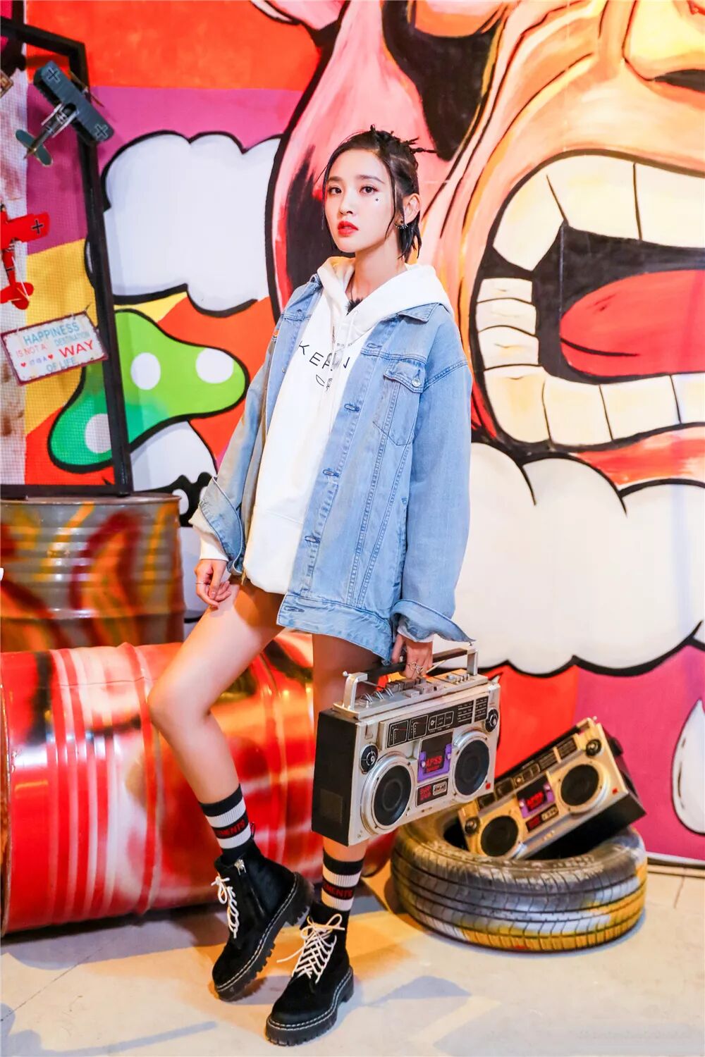 之后在唐艺昕工作室发出的综艺宣传图中,我又一次发现了这双鞋子的身影~来看当日的搭配,依旧是oversize的白色连帽卫衣加牛仔外套的的搭配,这次直接来了一个下衣失踪,还编起了小脏辫十分的摩登嘻哈啊~手里拎的老式收音机都想给好评!