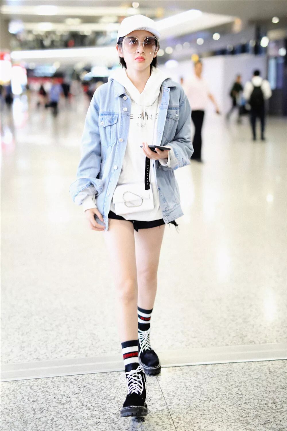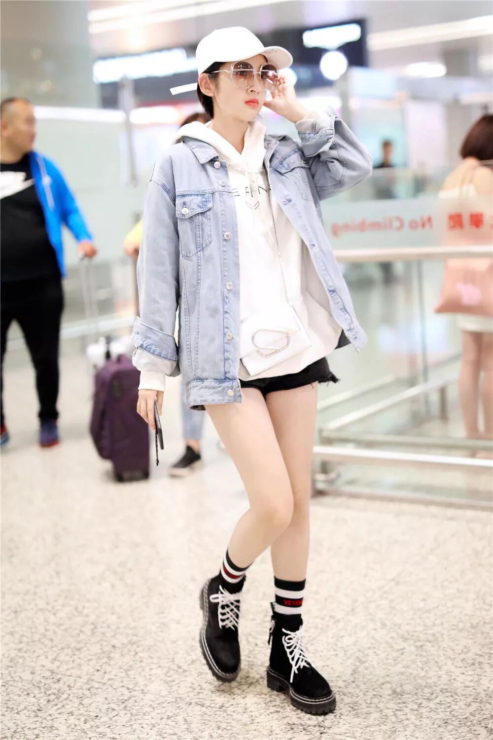 这不最早发现这双鞋子就是在去年9月份的机场私服中。唐艺昕一套上长下短的搭配,简单的白色卫衣加牛仔外套,戴一顶白色的鸭舌帽与茶色圆形墨镜,看起来十分青春靓丽,下身选择了最基础的黑色短裤,秀出来自己的大长腿!