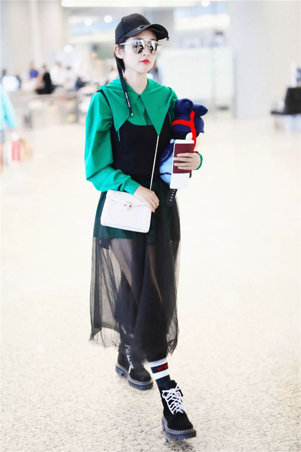 随后第二天,唐艺昕依旧选择了这双靴子与袜子的搭配,换了一套绿色的长袖连体套装与黑色的吊带纱裙搭配,帽子也换成的黑色系,从运动系少女变身轻熟风,这双鞋子依然hold的住啊!这时白色的鞋带就成了点缀作用,而通体的黑色则与纱裙呼应~