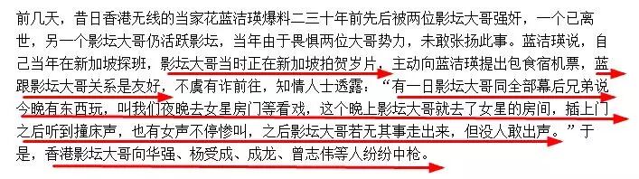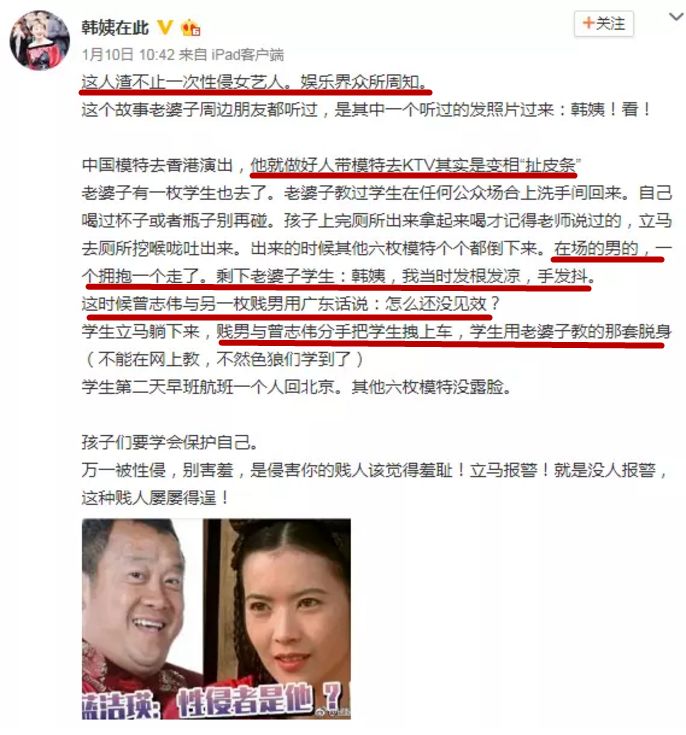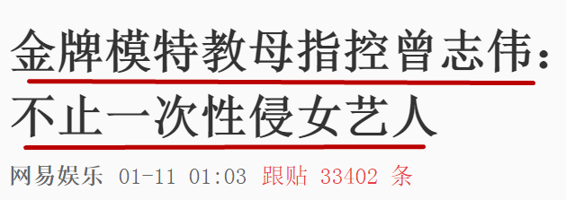 这位金牌模特教母在微博中的爆料指出:他“不止一次性侵女艺人”,并且变相“扯皮条”,文章称曾志伟和其他男子曾迷晕7名女模特,并把她们拽上车,其中一名侥幸逃脱。