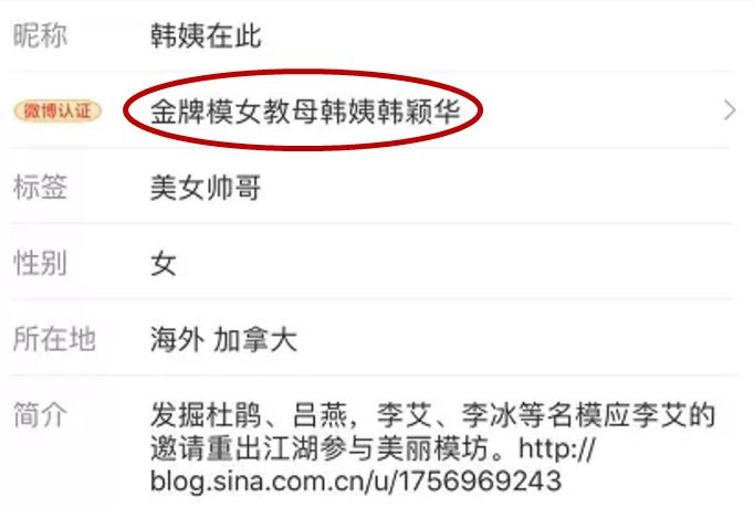 这位号称“金牌模女教母”的韩颖华根据微博认证上显示,她曾担任过美国Ford Models模特经纪公司亚太区总裁,旗下有超模“黑珍珠”Naomi Cambell,第一男模赵磊也是这家公司的。她还曾发掘杜鹃、吕燕,李艾、李冰等名模,在中国模特界有着“金牌模女教母”的美誉。