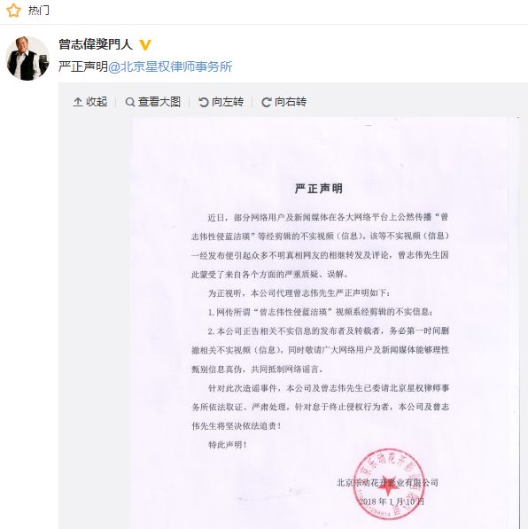 眼见事件不断发酵,作为当事人的曾志伟很快发出一则声明,否认该视频的真实性,称视频是经剪辑的不实信息。