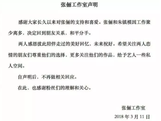 但不情不愿不长久,恋爱一年后,张俪官宣分手,理由是韩国艺人分手通用理由:聚少离多。