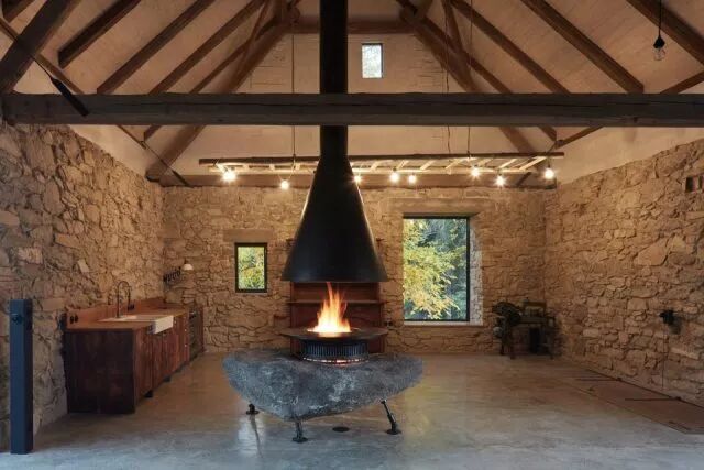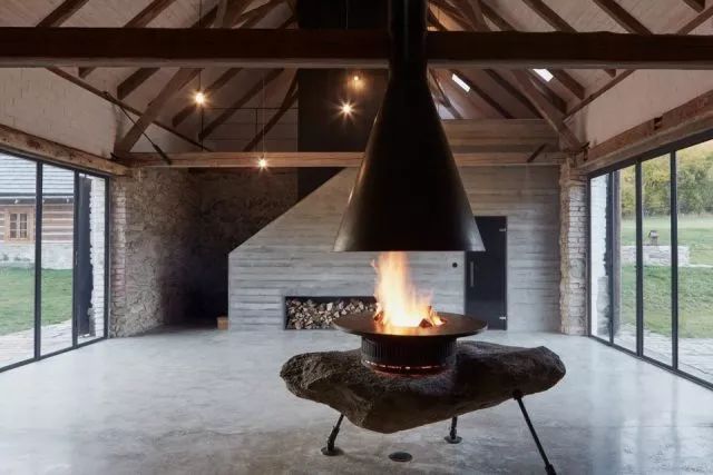中部设有开放壁炉,透过通透的玻璃折叠门和石墙上的取景窗可以尽享乡村风光