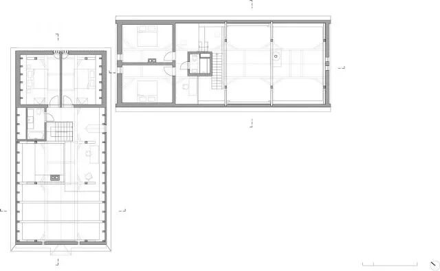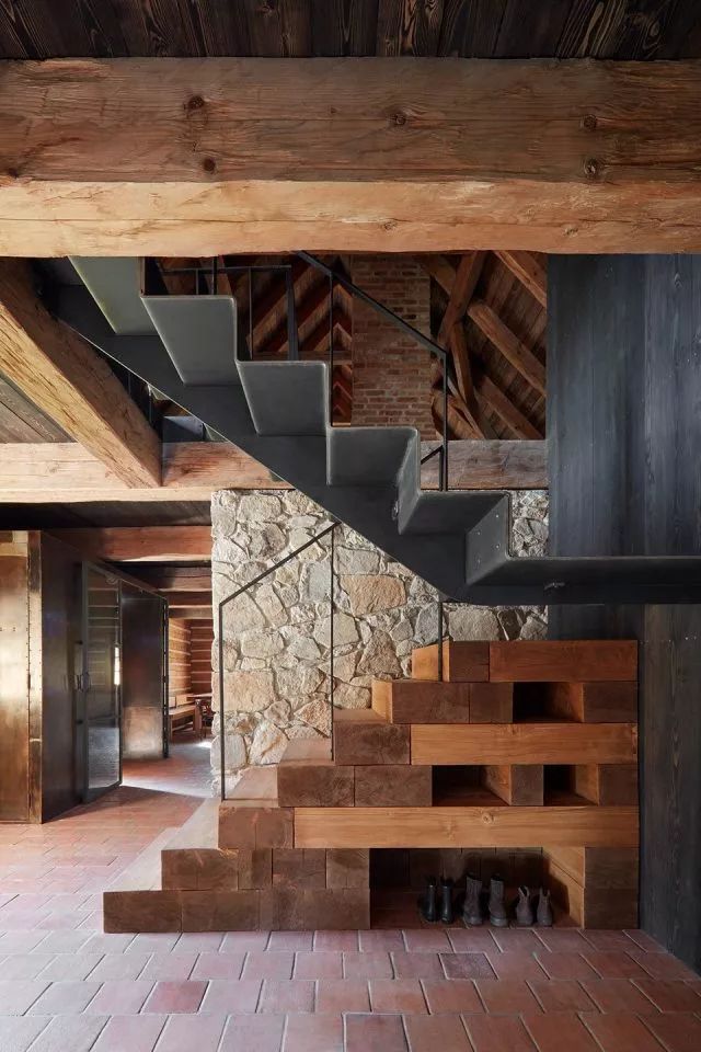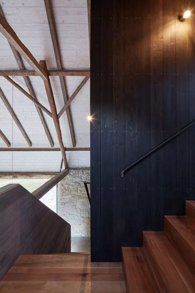 原本的宅地由一间小木屋和一个石头马厩组成,整体呈L形,自然舒展,与远方的牧场遥遥相望。为了保持这种平衡,建筑师决定尽量减少对建筑外观的改动,将改造主要集中在室内。每间房屋都设有一个直达屋顶的起居空间,可以突出展现二者的特点,如木屋中富有雕塑感的传统黑色厨房以及马厩门外优美的风景。此外,建筑师在两间房屋中分别增设了一个黑色“烟囱”,内设卫浴设施,其在马厩中占主导地位,而在木屋中则较为隐蔽。