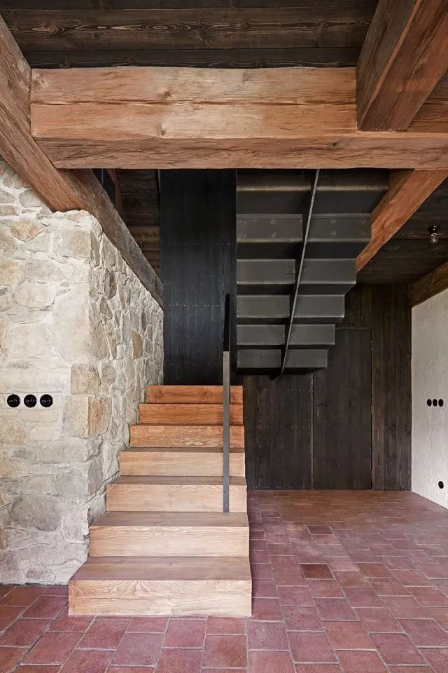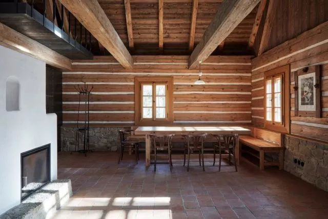 马厩和木屋有不同的特征和功能,建筑师在改造中充分体现了二者的差异性,这一思考贯穿了整个项目始终。业主的家庭居住在小木屋中,其内部更为传统。因为原本建筑条件太差,大部分空间都是重新建造的。粗糙的手工内饰使空间展现出了本地房屋昏暗、封闭而又亲密的特点。