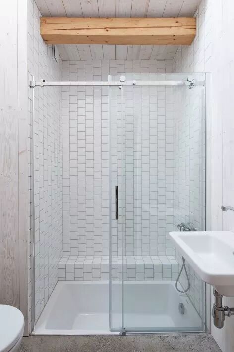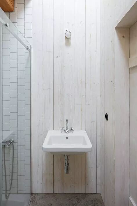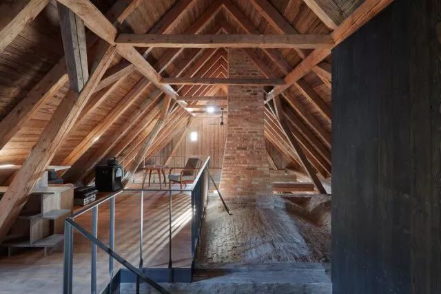 空间围绕新设的黑色卫浴核设置,白色墙面和天花突显木制屋架