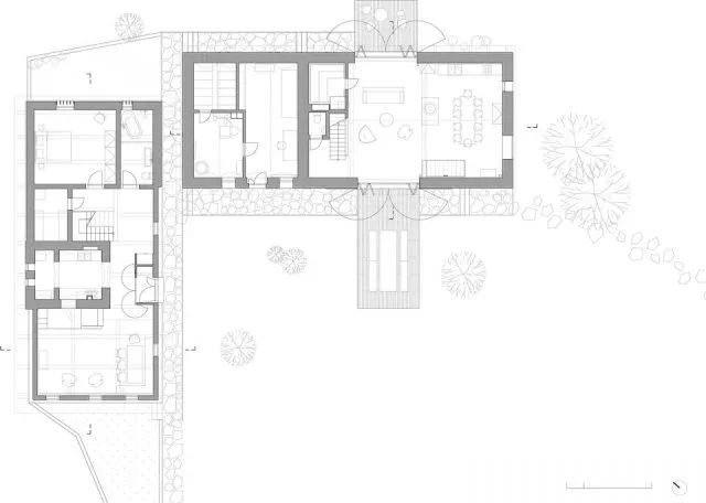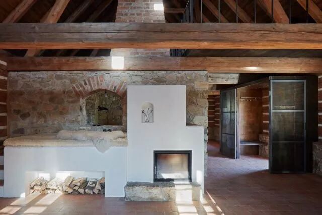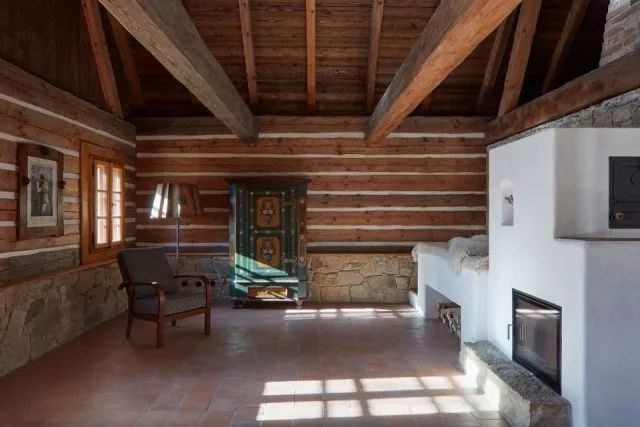 马厩为辅助用房,其中设有避暑客厅和客房,建筑师对其进行了较多介入,空间的整体氛围更为明亮开放。原本的石墙被混凝土墙面取代,其后藏有楼梯间和桑拿房。上方的室内墙面全部被涂成白色,以突显原本的木制屋架。主要的起居空间通过玻璃折叠门与室外露台相连,人们还可以通过一面巨大的固定窗欣赏草原上古老的树木。空间的核心是一个开放壁炉,由附近山中采到的巨大石块制成。
