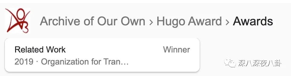 可AO3也确实因为“自由”,而有所收获。之前还得过雨果奖的“最佳相关作品奖”(雨果奖,就是刘慈欣获奖的那个,被称为科幻小说界的奥斯卡)