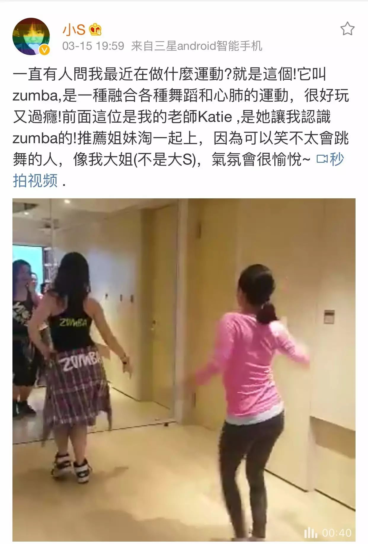 明星们一天天的真会玩!韩国跳郑多燕,中国跳广场舞,南美跳zumba(尊巴)。虽然郑多燕的舞蹈热度还没完全退去, 小S 等有炒火了尊巴,关键大小媒体和广大网友们都很买账,除了大赞小 S 婀娜的舞姿之外,也刮起了一波 zumba (尊巴)秀。